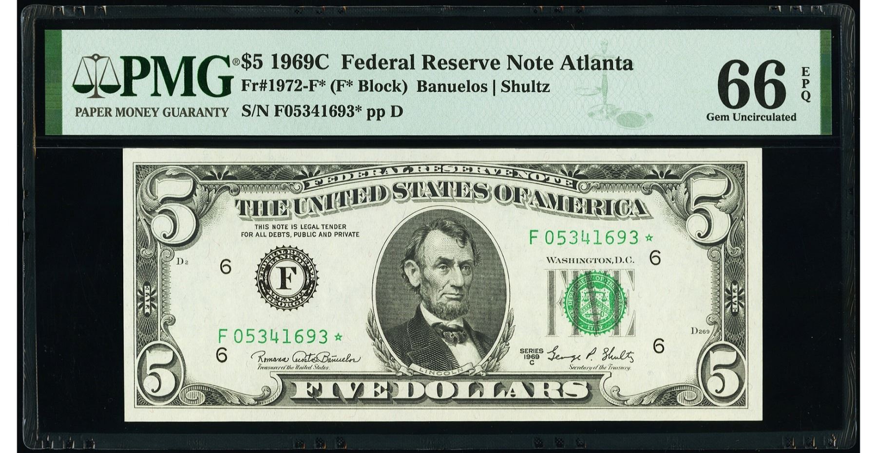 One 1969C $5 STAR Atlanta FRN PMG 66EPQ.