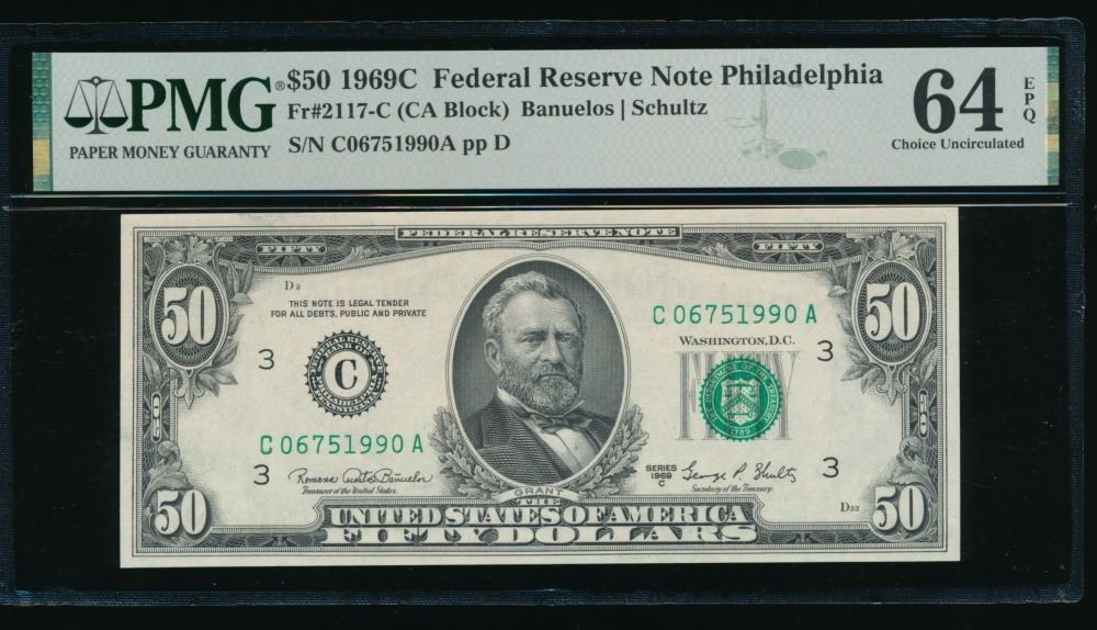 One 1969C $50 Philadelphia FRN PMG 64EPQ.
