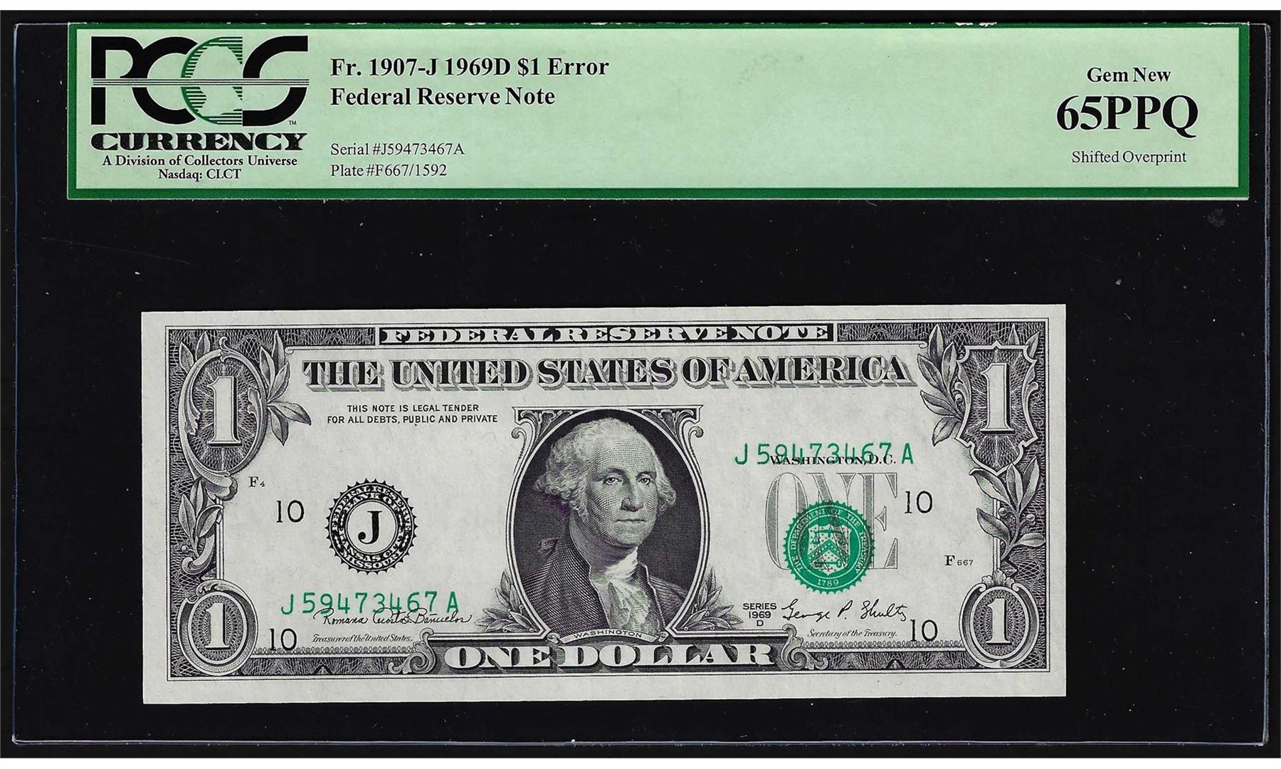 One 1969D $1 Federal Reserve ERROR Note Shifted Overprint PCGS Gem New 65PPQ. PCGS Graded.