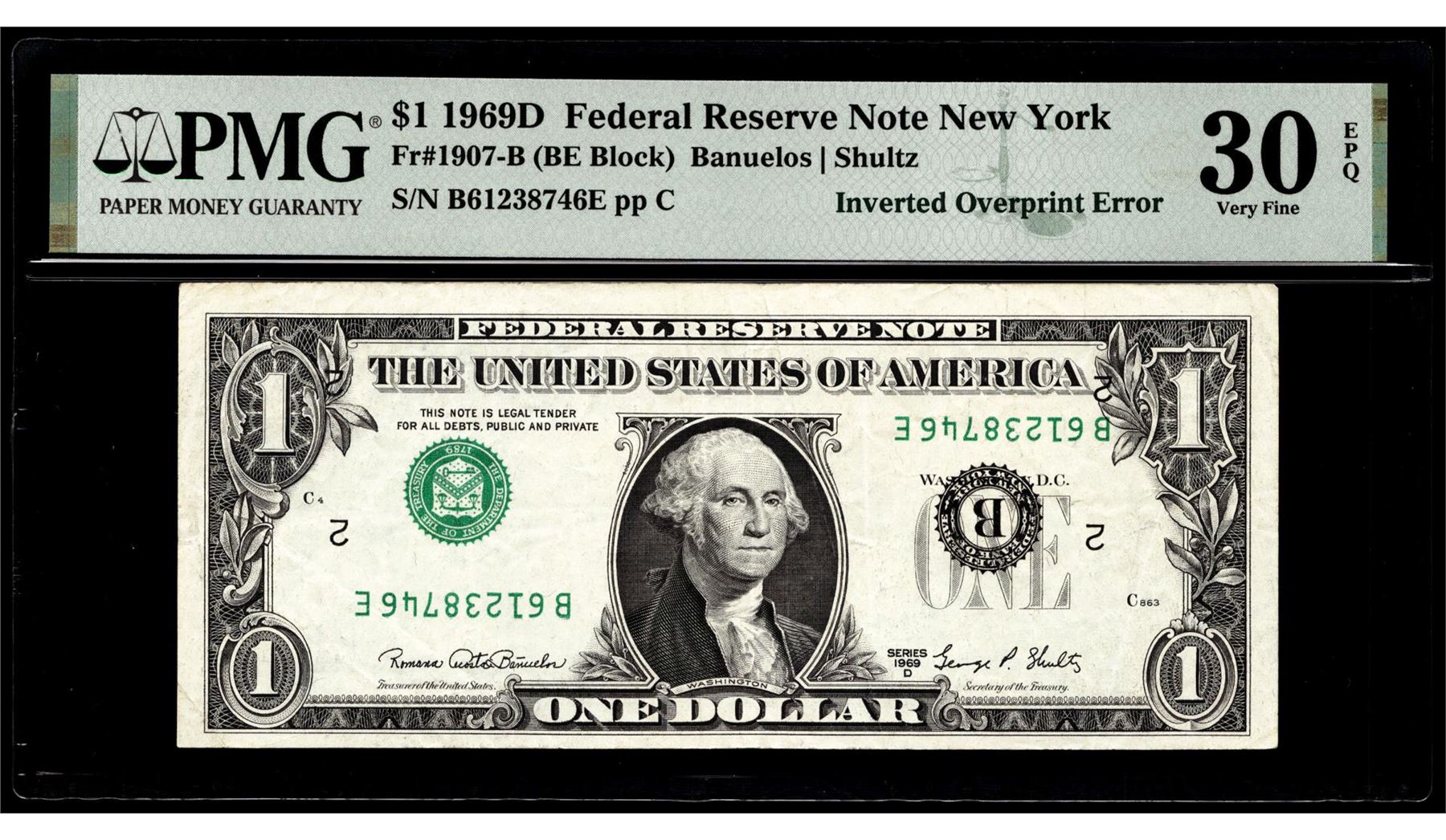 One 1969D $1 Federal Reserve Inverted Overprint Error Note Fr.1907-B PMG Very Fine 30EPQ. PMG Certified.