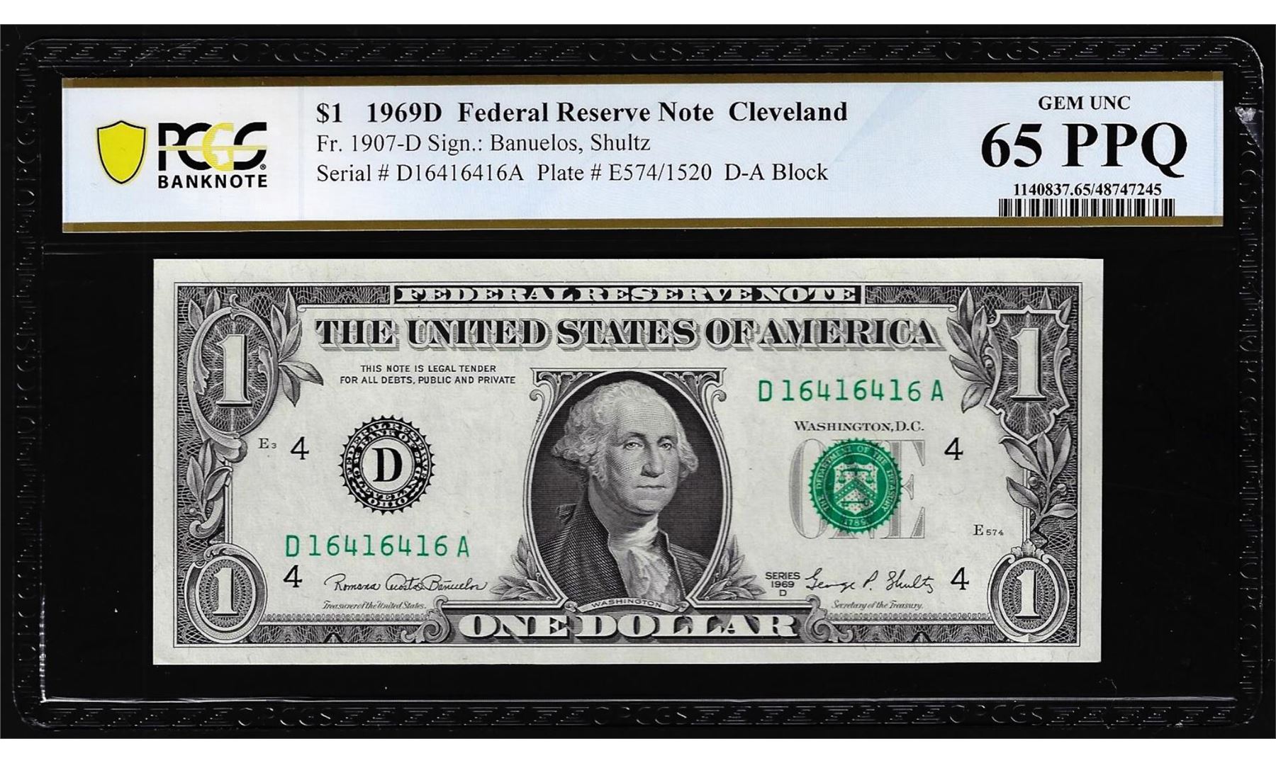 1969D $1 Federal Reserve Note Cleveland Fr.1907-D PCGS Gem Unc 65PPQ Fancy Serial