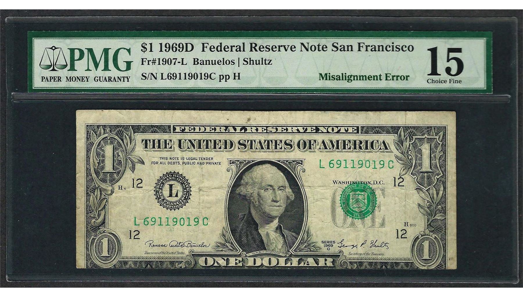 One 1969D $1 Federal Reserve Note ERROR Misalignment PMG Choice Fine 15. PMG Certified.