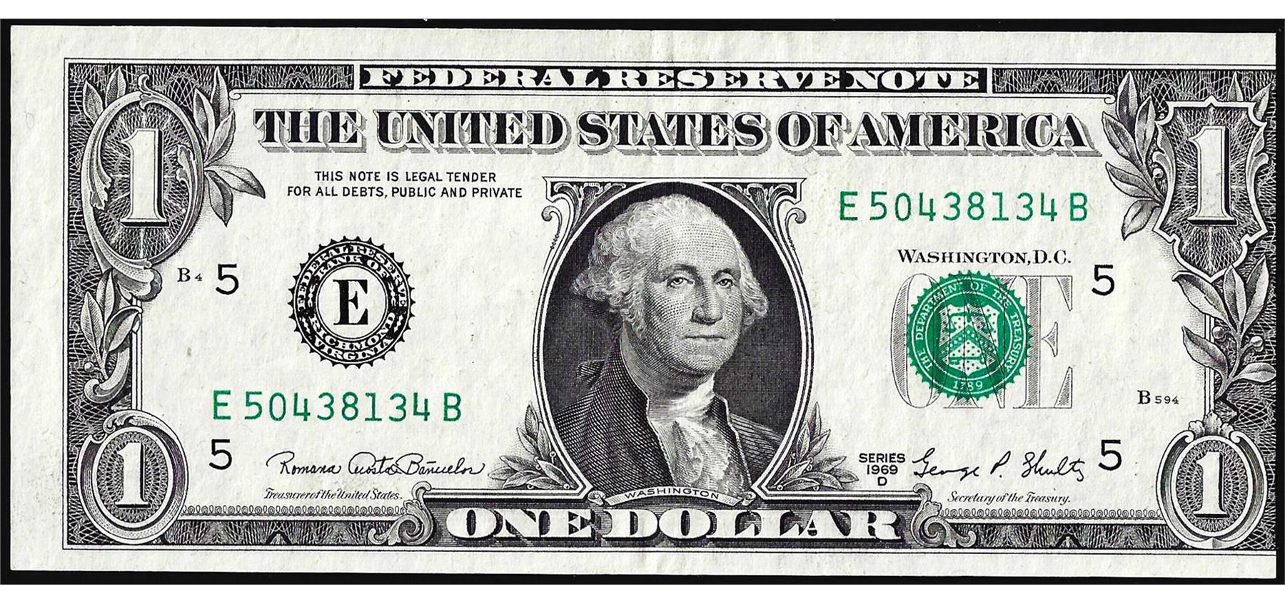 One 1969D $1 Federal Reserve Note Misaligned Printing Error.