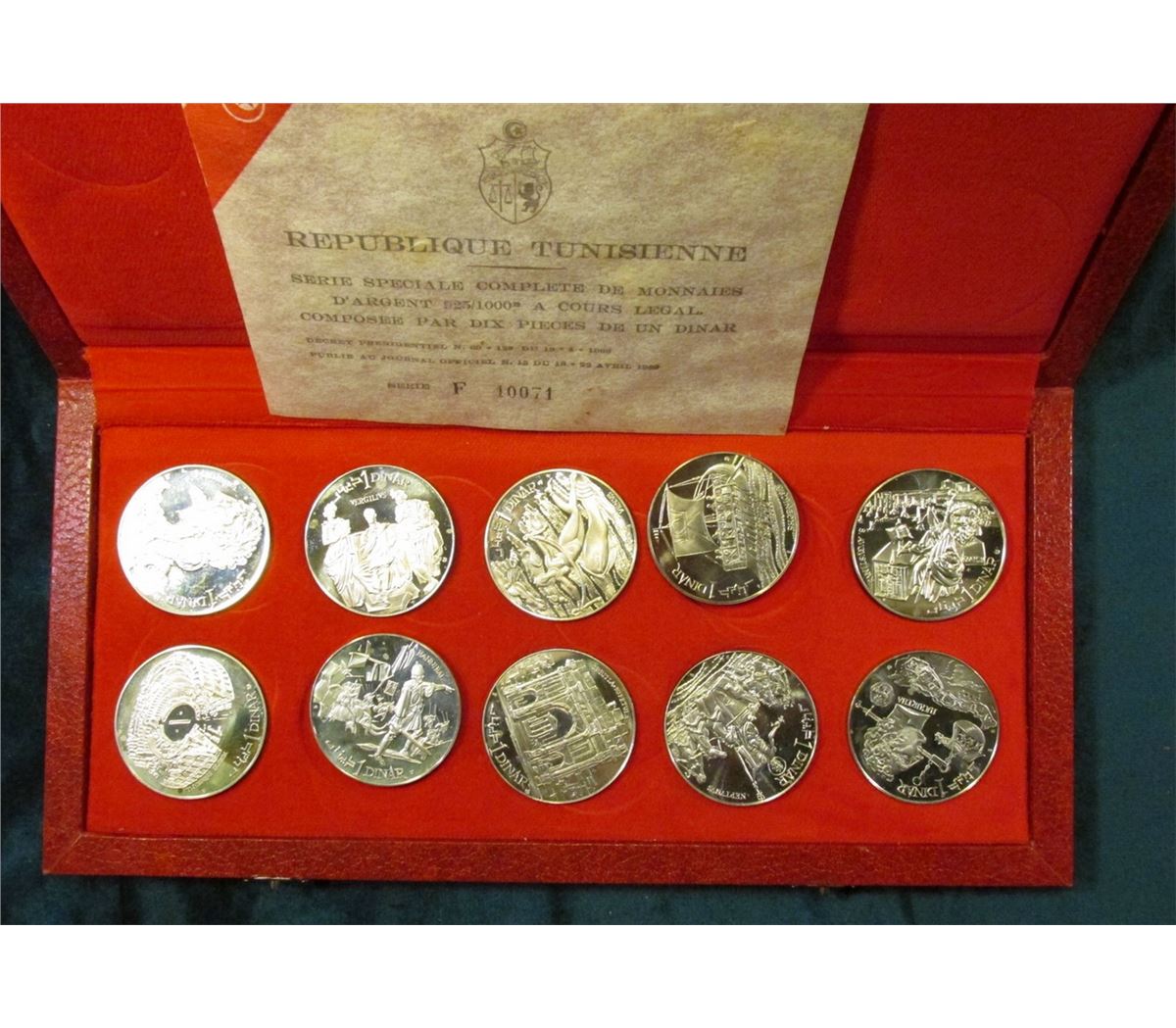 1969FM-NI Republic of Tunisia Sterling Silver Ten-Piece Proof Set in original box of issue with literature. PS3. Most of these sets were destroyed while in storage, this set is in excellent condition. Only 15,202 were minted. KM value $220.00.