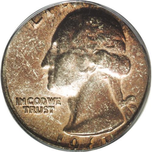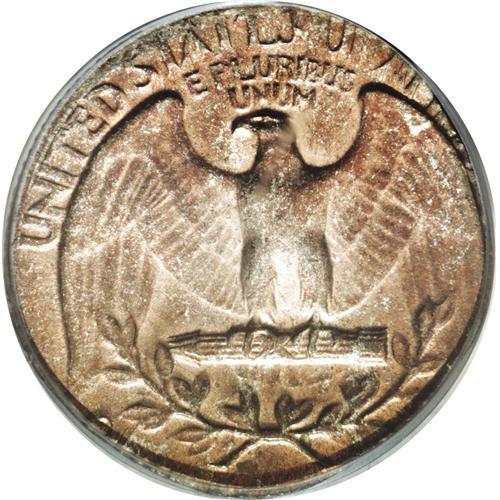 <B>196?<25C> Washington Quarter--Struck on a Cent Planchet--MS63RB PCGS.</B></I> Struck slightly off-center toward 3 o'clock, the Washington quarter image shows all of IN GOD WE TRUST and an apparent 196 in the date, but it is anyone's guess what the last digit might be, although 3, 8, and 9 are good possibilities. The coin shows mottled red, silver, and blue toning on both sides and is Mint State.