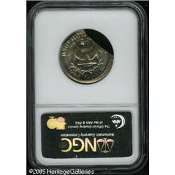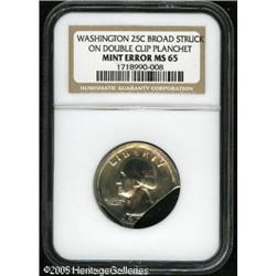 <B>197?-? Washington Quarter--Broadstruck on Doubled Clipped Planchet--MS65 NGC.</B></I> A straight clip is between 3 and 6 o'clock, a second straight clip is between 7 and 8:30. The right half of the date and the mintmark are absent because of the first clip, although a portion of the 7 in the date is present. The irregularly shaped planchet perhaps obstructed the collar die; the broadstrike is well centered.    Lot:10999