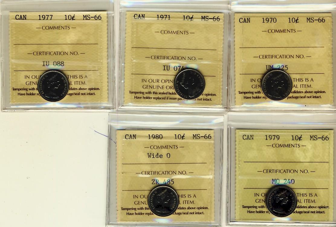 1970 10¢ 1971, 1977, 1979 & 1980 Wide ICCS MS66. Lot of 5 coins.
