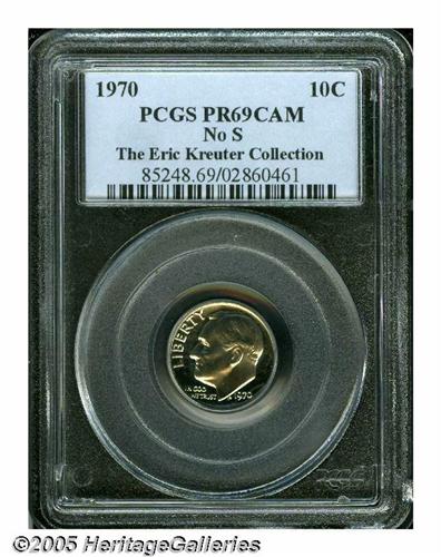 <B>1970<10C Error> No S PR69 Cameo PCGS.</B></I> Collectors first reported the discovery of this mint error on January 6, 1971. Just shy of two months later, Mint officials admitted that 2,200 1970 No S proof Dimes had been produced from a single set of dies. As had happened two years prior with the No S 1968 proof Dime, a mint worker neglected to punch a mintmark into the die. The die scratch beneath the right upright of the N in UNITED is diagnostic. This coin looks as fresh, bright, and new as the day it was struck 34 years ago. The fields go absolutely "black" when angled beneath a light, and the devices are nicely frosted--the combination of both providing a stark cameo contrast on each side. Population: 2 in 69, none finer (5/05).