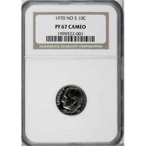 <B>1970 10C No S PR67 Cameo NGC.</B></I> An attractive example of this popular missing-mintmark issue, crisply struck with light, yet distinct contrast between the gleaming mirrors and faintly frosted devices. Immensely appealing. Census: 6 in 67 Cameo, 19 finer (3/08).<BR><BR><b>Shipping:</b> Coins & Currency (<a target="_blank" href="http://www.heritageauctions.com/common/shipping.php">view shipping information</a>)