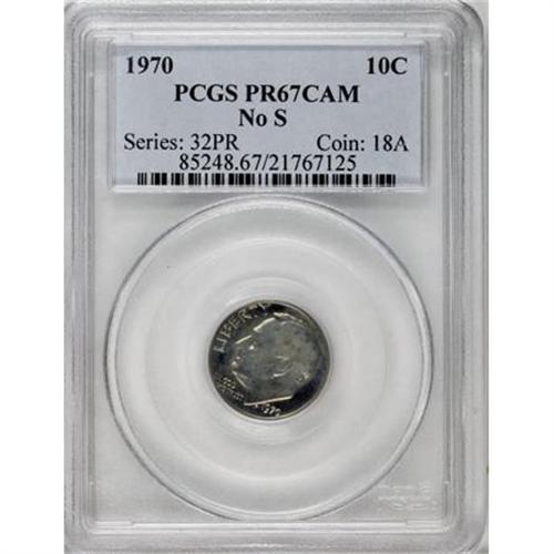 <B>1970 10C No S PR67 Cameo PCGS.</B></I> An attractive Cameo Superb Gem representative of this popular missing-mintmark variant, well-defined with appreciable contrast despite a measure of rose-gold haze across the obverse. Population: 16 in 67 Cameo, 28 finer (2/08).<BR><I>From The Chippewa Valley Collection.</B></I><BR><BR><b>Shipping:</b> Coins & Currency (<a target="_blank" href="http://www.heritageauctions.com/common/shipping.php">view shipping information</a>)