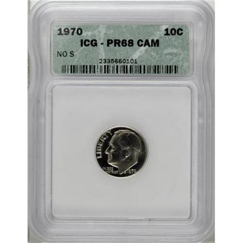 <B>1970 10C No S PR68 Cameo ICG.</B></I> A virtually pristine example of this modern mint error rarity, which has an estimated mintage of just 2,200 specimens. Strongly contrasted, particularly on the reverse, with just a hint of golden toning over the portrait.<BR><BR><b>Shipping:</b> Coins & Currency (<a target="_blank" href="http://www.heritageauctions.com/common/shipping.php">view shipping information</a>)