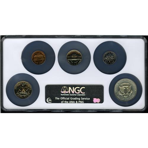 <B>1970<10C> No S PR68 Cameo NGC. Part of a Five-Piece NGC-Certified Proof Set.</B></I> One of the earliest of the various proof No S errors, preceded only by the 1968 No S proof dime. Delicate gold toning visits exemplary, pinpoint-sharp surfaces. The other four pieces include: <B>Large Date cent PR68 Red; nickel PR68; quarter PR69;</B></I> and a <B>half dollar PR67.</B></I>