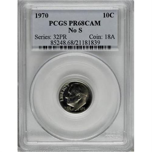 <B>1970 10C No S PR68 Cameo PCGS.</B></I> The no-mintmark Roosevelt proof dimes of 1970 were the second such error for the denomination in just three years. This gleaming example offers wonderful preservation and heavy contrast. Just a touch of champagne patina visits the margins. PCGS has graded just two finer Cameo examples (12/07).<BR><BR><b>Shipping:</b> Coins & Currency (<a target="_blank" href="http://www.heritageauctions.com/common/shipping.php">view shipping information</a>)
