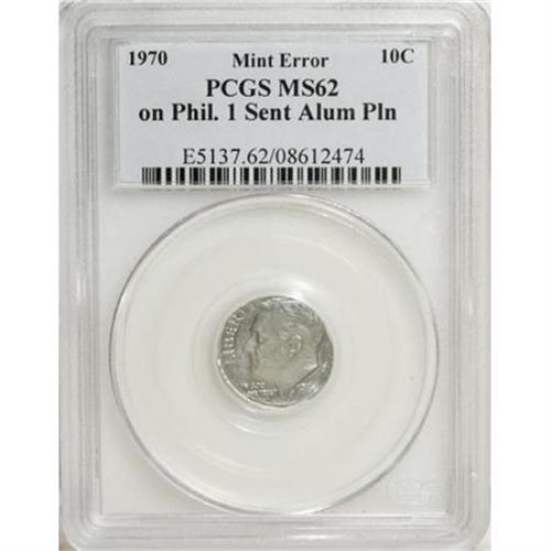 <B>1970 10C Roosevelt Dime--On an Aluminum Philippines Sentimo Planchet--MS62 PCGS.</B></I> FS-801, formerly FS-020.6. UNITED STATES OF is nicely die doubled. <I>Cherrypickers'</B></I> calls this variety "extremely rare." Perhaps the only example from these dies struck on an aluminum Philippines sentimo planchet. (The U.S. Mint struck Philippines sentimos, KM-196, in 1970.) The fields are prooflike, and the obverse rim is prominently raised (and abraded) between 5 and 9 o'clock.<BR><BR><B>Coin Engraver:</B> John R. Sinnock<BR><BR><b>Shipping:</b> Coins & Currency (<a target="_blank" href="http://www.heritageauctions.com/common/shipping.php">view shipping information</a>)
