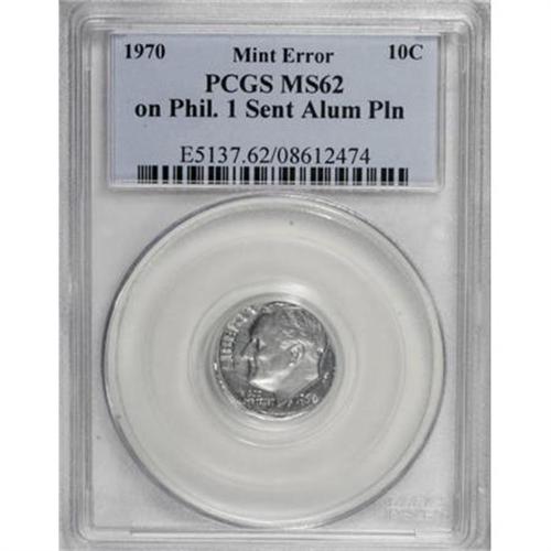 <B>1970 Roosevelt Dime--On an Aluminum Philippines Sentimo Planchet--MS62 PCGS.</B></I> FS-801, formerly FS-020.6. UNITED STATES OF is nicely die doubled. <I>Cherrypickers'</B></I> calls this variety "extremely rare." Perhaps the only example from these dies struck on an aluminum Philippines sentimo planchet. (The U.S. Mint struck Philippines sentimos, KM-196, in 1970.) The fields are prooflike, and the obverse rim is prominently raised (and abraded) between 5 and 9 o'clock.<BR><BR><B>Coin Engraver:</B> John R. Sinnock<BR><BR><b>Shipping:</b> Coins & Currency (<a target="_blank" href="http://www.heritageauctions.com/common/shipping.php">view shipping information</a>)