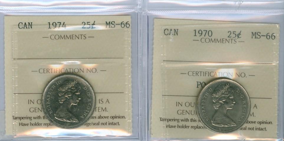1970 & 1974 25¢ ICCS MS66. Gem issues.