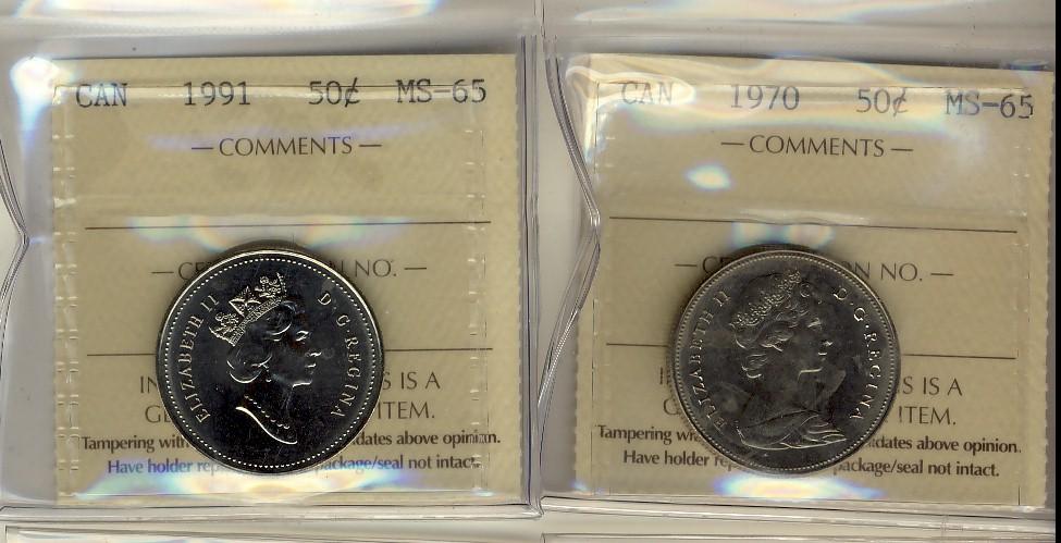 1970 & 1991 50¢ ICCS MS65. Lot of 2 coins.