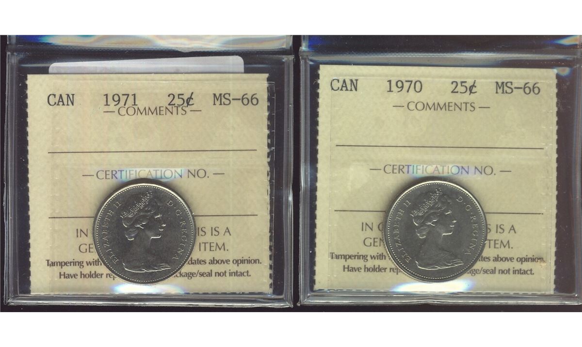1970 25¢ & 1971 ICCS MS66. Lot of 2 coins.