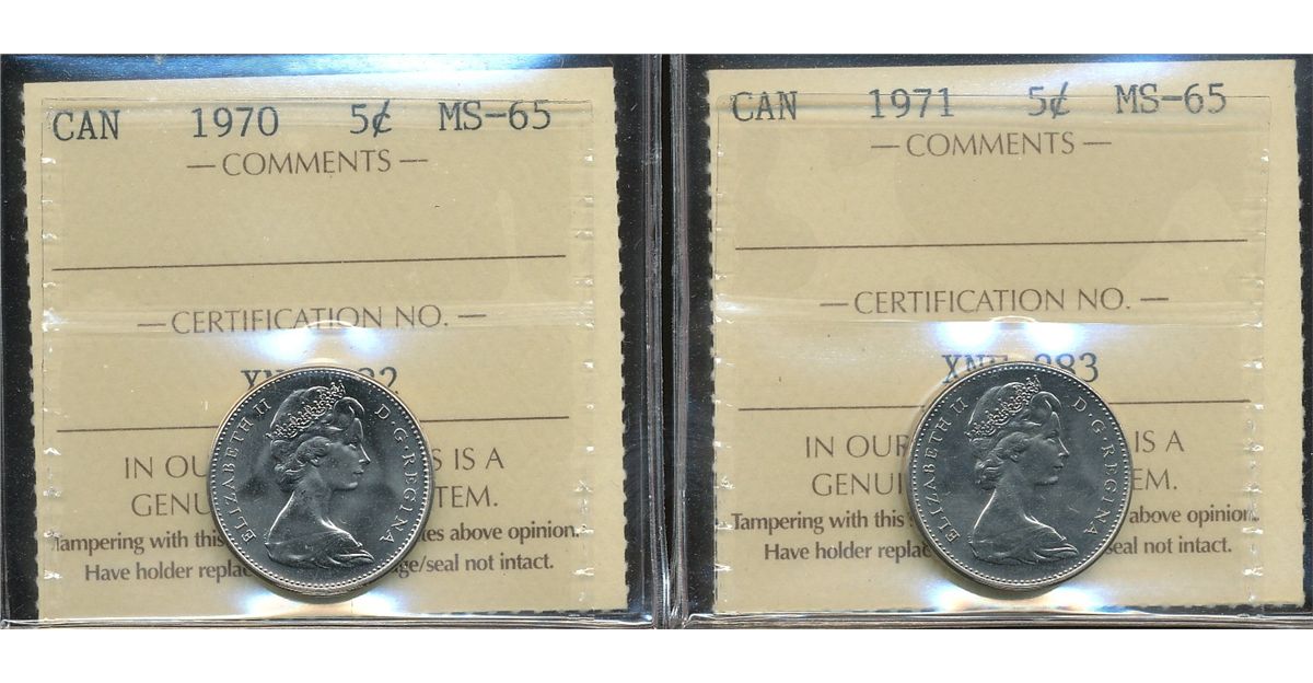 1970 5¢ & 1971 ICCS MS65. Lot of 2 gem issues.