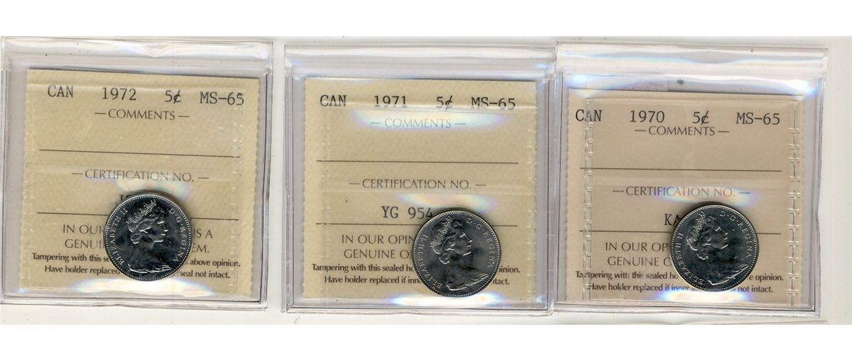 1970 5 Cents, 1971, 1972 ICCS MS65; Three coins.
