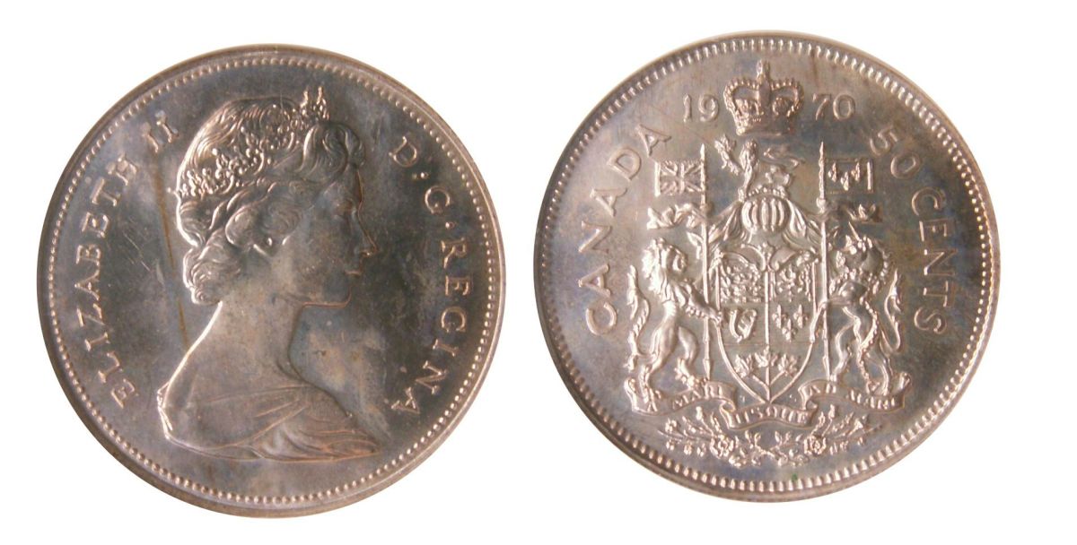 1970 50¢ MINT ERROR NGC PL63. 69% Silver and 31% Copper off metal. First example handled by TCNC. Believed to be very rare. The coin is well struck with reflective surfaces. A major and very spectacular ERROR coin. Should be viewed.