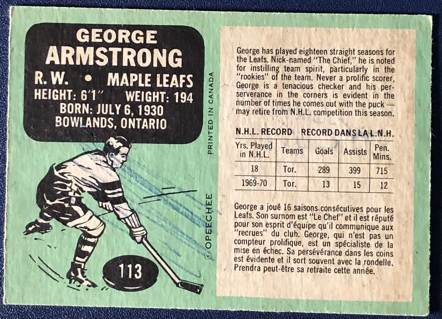 Card #113                                NHL, hockey, OPC, vintage, hall of fame