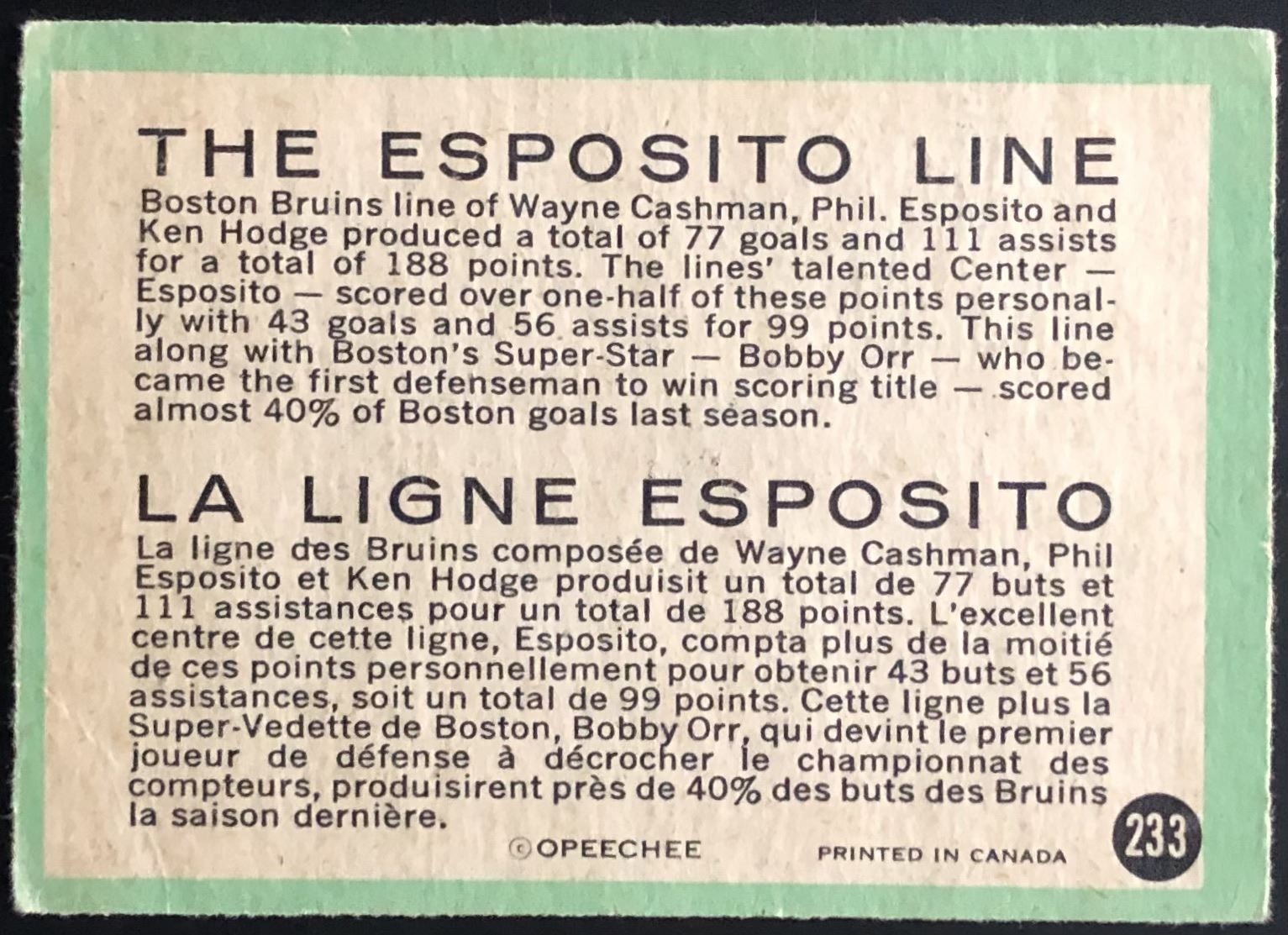 Card #233 NHL, hockey, OPC, vintage, hall of fame