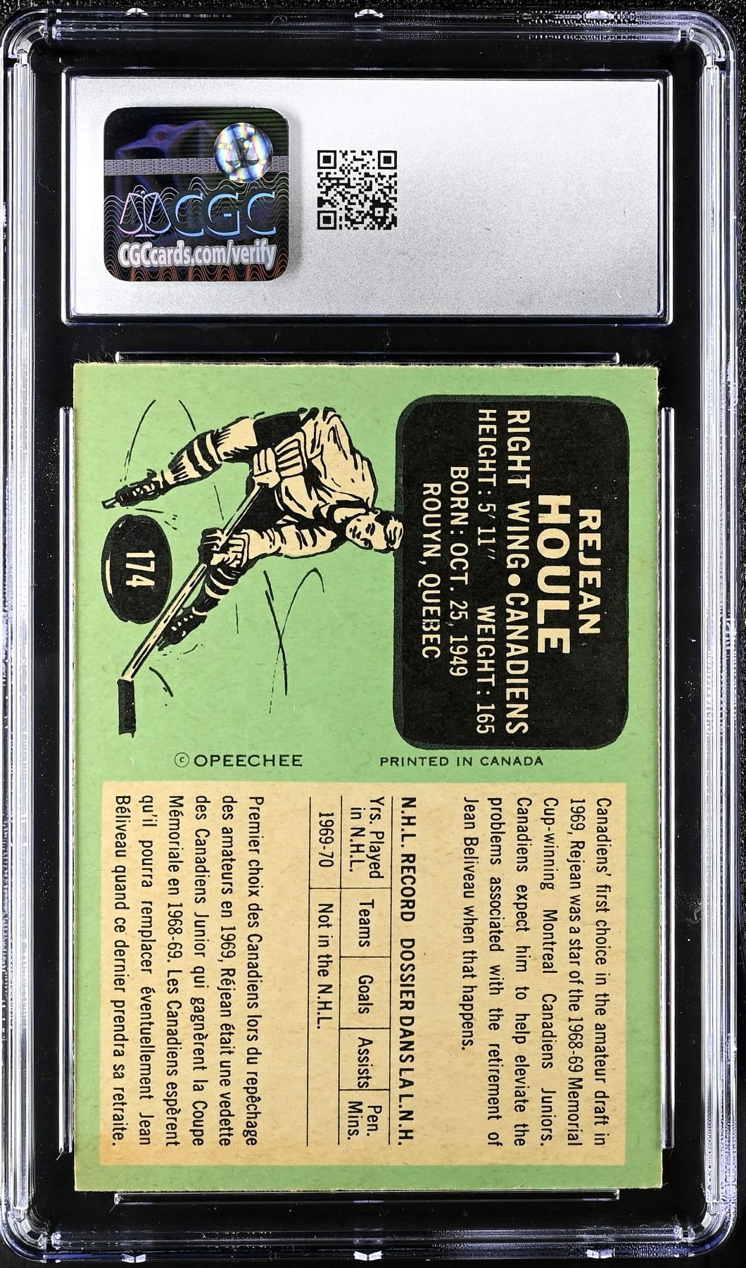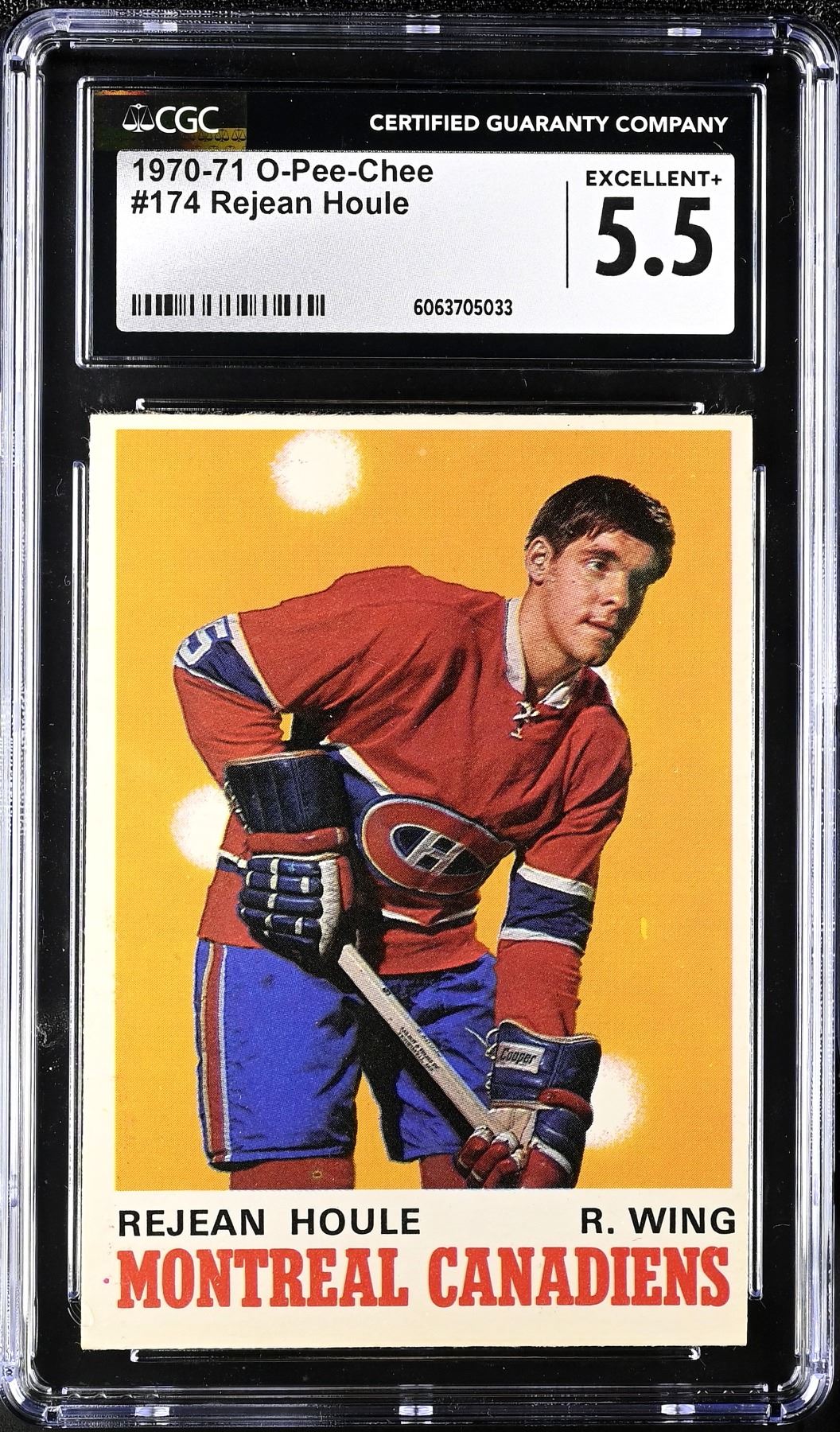 Rookie card of Canadiens stalwart Rejean Houle who broke in and won a pair of Stanley Cups in his first four seasons before jumping to the WHA for three seasons. He would come back to Montreal for the 1976-77 season and win three more Cups over the next three seasons. He was a strong two-way forward who chipped in offensively in a very deep Canadiens squad. Graded 5.5 EX+ by CGC.
