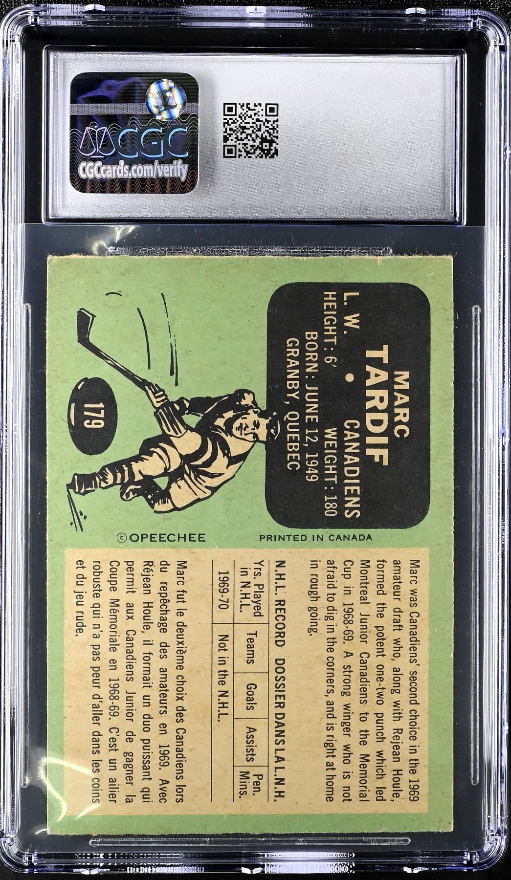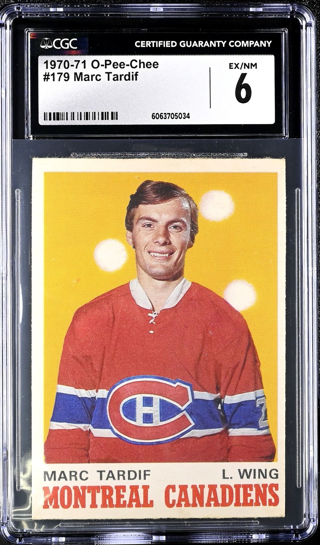 Rookie card of Tardif who broke in and won a pair of Stanley Cups with the Canadiens in his first four years before jumping to the WHA. He would play seven seasons in the WHA, finding a home with the Quebec Nordiques, where he'd lead the league in scoring twice and win two MVP awards as well as wining an Avco Cup in 1977. He would finish his career with Quebec after the franchise gained entry to the NHL. Graded a sharp 6 EX-NM by CGC.