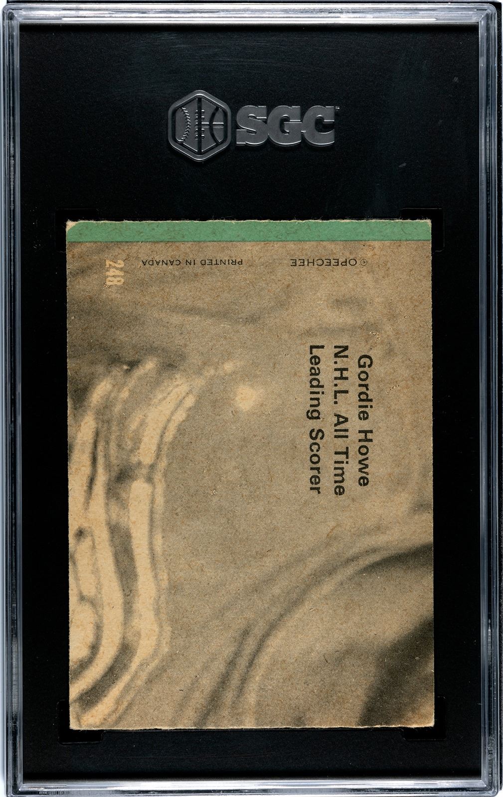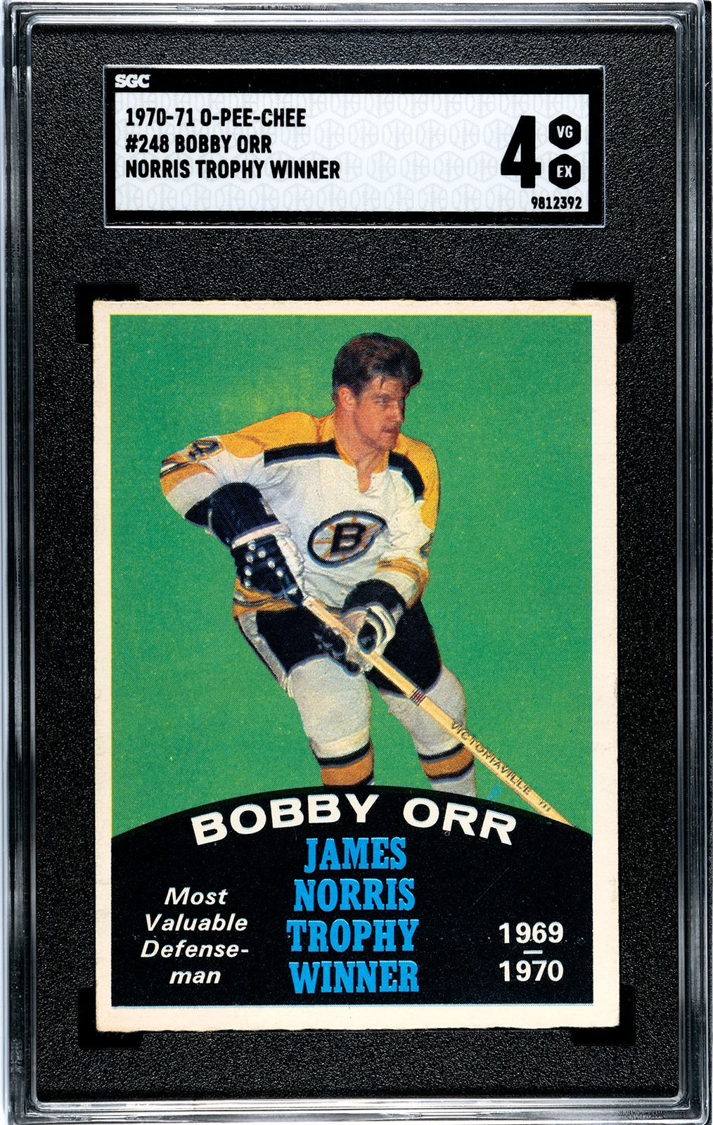 Mid-grade example of Orr's Norris Trophy card from this classic set. This was his 3rd of 8 consecutive Norris wins. Graded 4 VG-EX by SGC.