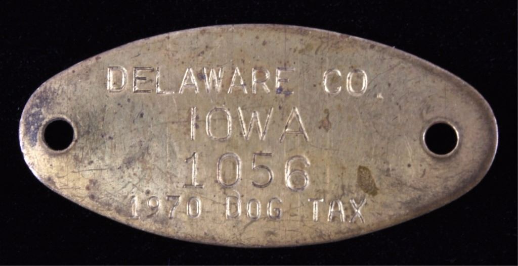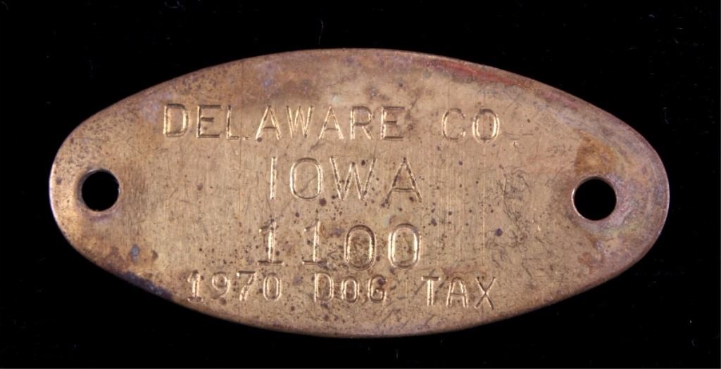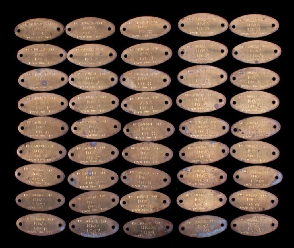 This is a collection of 35 brass dog licenses. All the licenses are dated "1970". They are all sequentially numbered 1056 to 1100. Each tag shows good condition with some patina. The dog licenses measure .75" x 2".