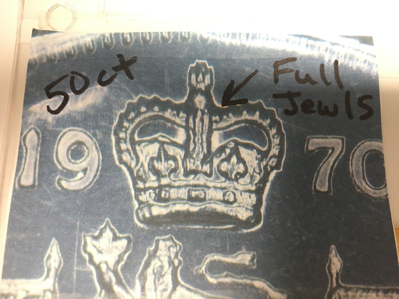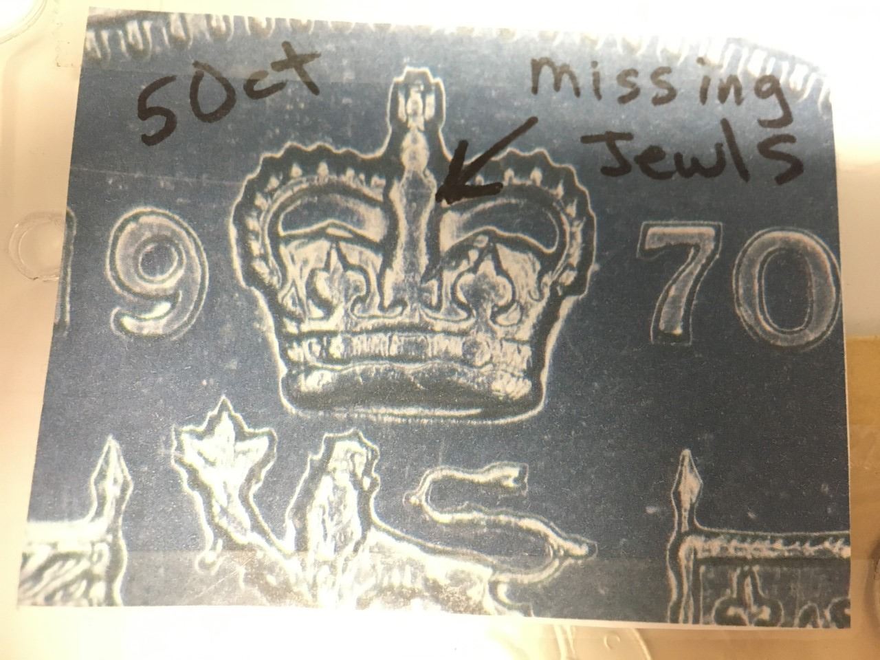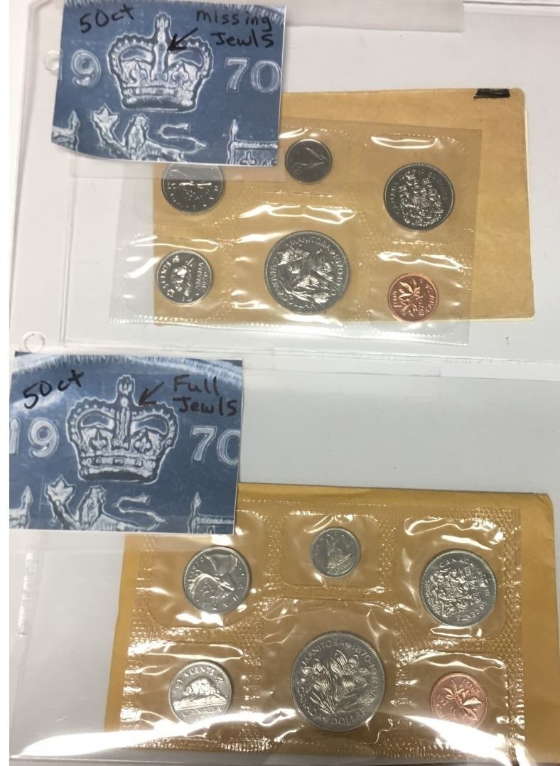 One 50 cent piece is missing jewels in the crown. One has jewels in the crown.