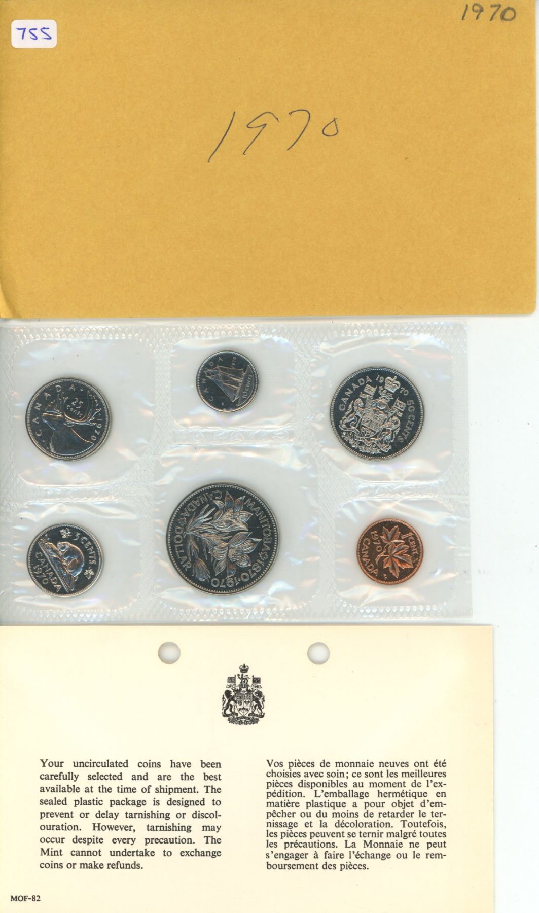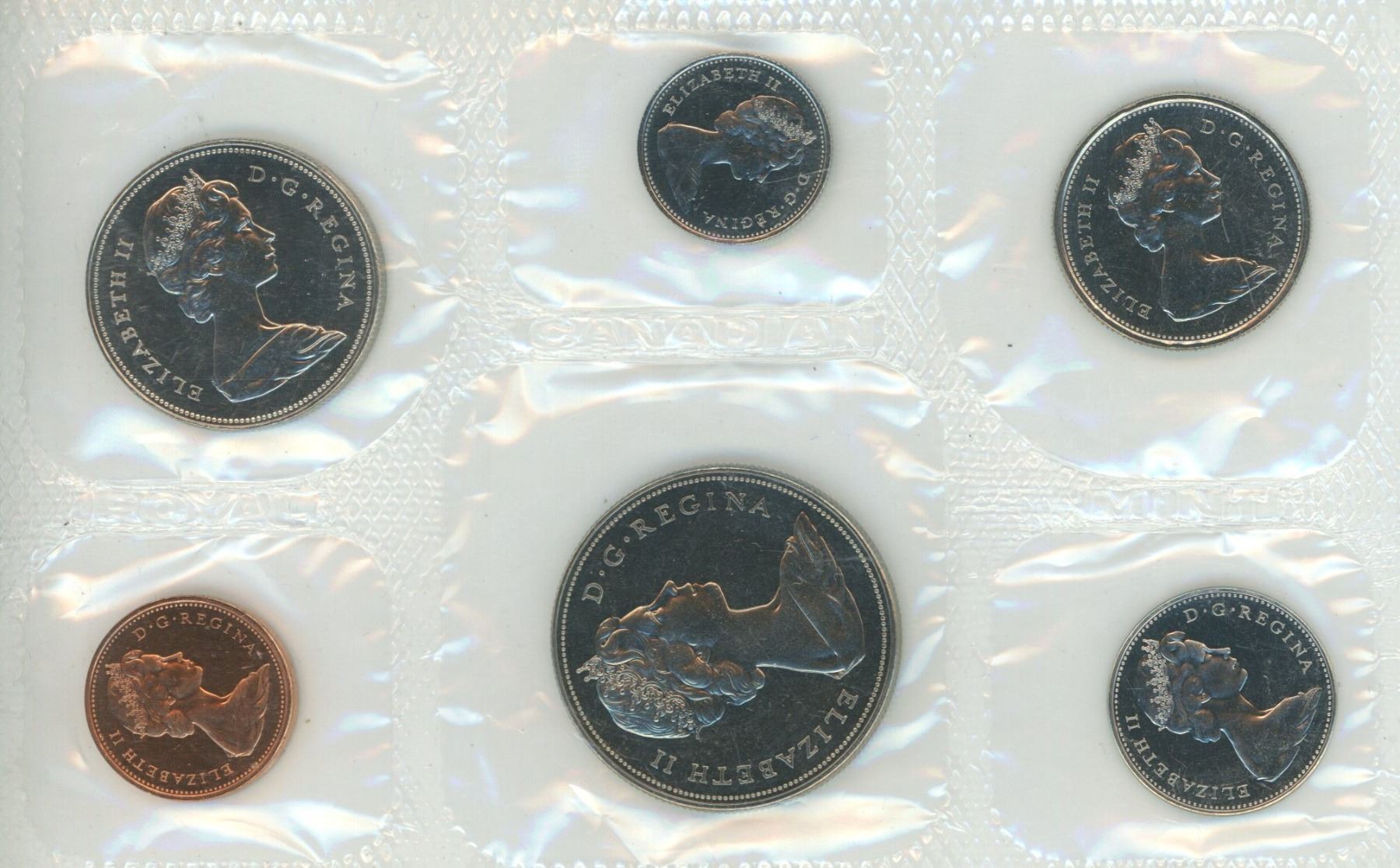 1970 Canadian Proof Like Set. The Dollar commemorates the 100th Anniversary of Manitoba joining Canada in 1870. 6-coin set. One coin has a Cameo.