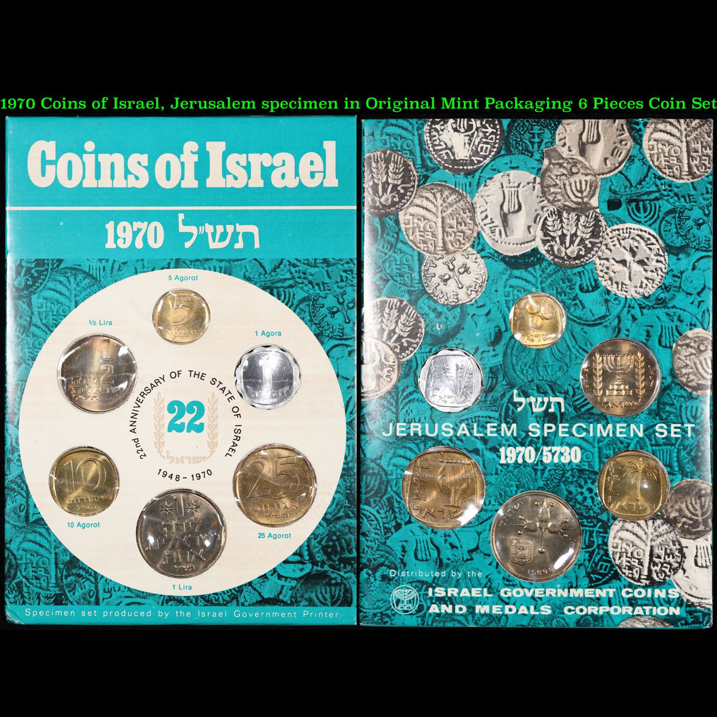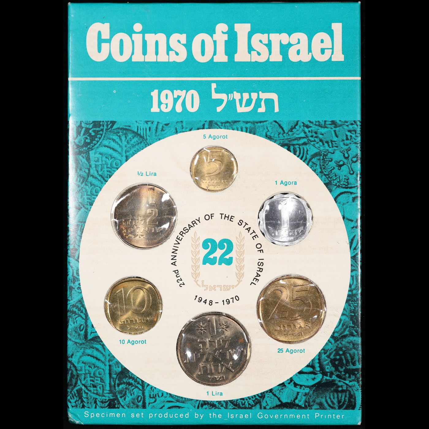 1970 Coins of Israel, Jerusalem specimen in Original Mint Packaging 6 Pieces Coin Set. Set in Original Mint Packaging the 1970 Israeli coin set is composed of six different denominations 1 agora, 5 agora, 10 agora, 25 agora, half-lira, and 1 lira. These coins are part of the 1975 year set issue that have the Star of David. Four of these coins are made of aluminum-bronze. The 1 agora coin is made of aluminum and the 1 lira coin is made of copper-nickel. One side of the coins all have the country name and face value in Hebrew, an engraving from old coins, and the Star of David. The other side of the coins features different agricultural products of Israel and the state emblem of Israel: a menorah flanked by two olive branches. However, the half-lira coin only shows the state emblem. The coins in the set are in mint condition.