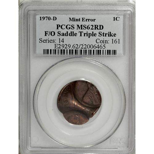 <B>1970-D 1C Lincoln Cent--Fold-Over Triple Saddle Strike--MS62 Red PCGS.</B></I> First struck off-center, this magenta and rose-violet error flipped over before it landed between two dies of a double or quadruple press and received simultaneous off-center strikes. A fascinating error.<BR><BR><b>Shipping:</b> Coin/Currency (<a target="_blank" href="http://www.heritageauctions.com/common/shipping.php">view shipping information</a>)