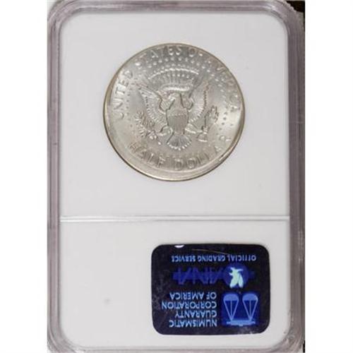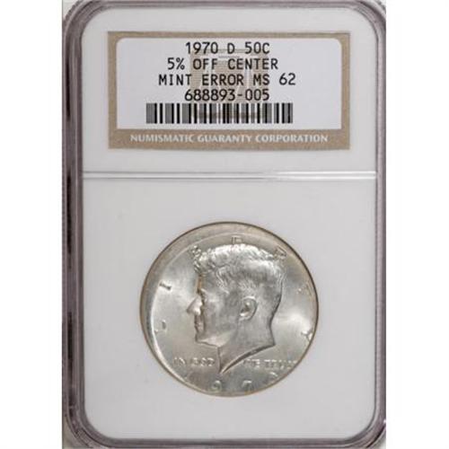 <B>1970-D 50C Kennedy Half--5% Off Center--MS62 NGC.</B></I> Moderately off center toward 5 o'clock. Nearly all of the date is present, but a large arc of unstruck surface is centered at 10:30. Lustrous and boldly struck with light gold toning.<BR><BR><B>Coin Engraver:</B> Gilroy Roberts and Frank Gasparro<BR><BR><b>Shipping:</b> Coins & Currency (<a target="_blank" href="http://www.heritageauctions.com/common/shipping.php">view shipping information</a>)
