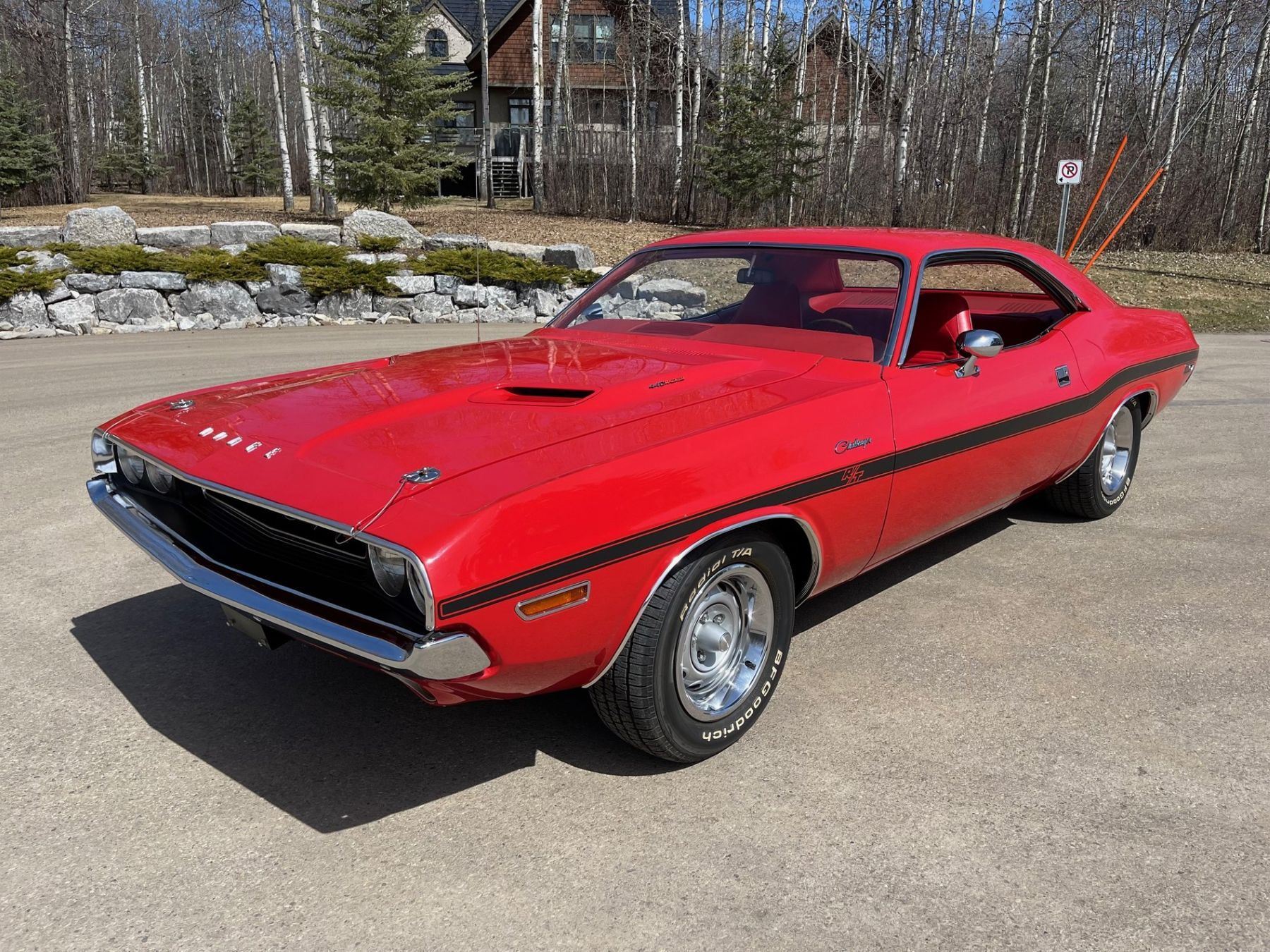 1970 Dodge Challenger RT 440. This stunning factory RT has underwent a complete rotisserie show quality restoration starting with only 59,000 original miles. This car was completely restored with only approximately 100 show miles on it currently. 440 U code magnum engine and is a factory red red car with bucket seats and consul. These color combinations are extremely rare and it is believed to be one of one in this color combination. The 440 RT is documented with its factory build. This stunning, one-of-a-kind RT challenger retains its original data tag and VIN number. The other side of the car is as nice as the top with everything restore to factory specifications Including The Trunk compartment. 375hp engine complimented to its factory, torque flight automatic, three speed transmission. The engine bay has been detailed to complete factory specifications. Alberta Registered