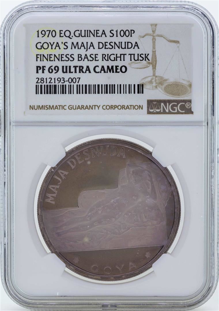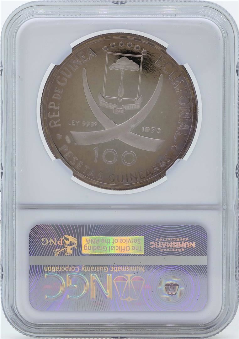 One 1970 Equatorial Guinea 100 Pesetas Proof Silver Coin NGC PF69 Ultra Cameo. NGC Certified.