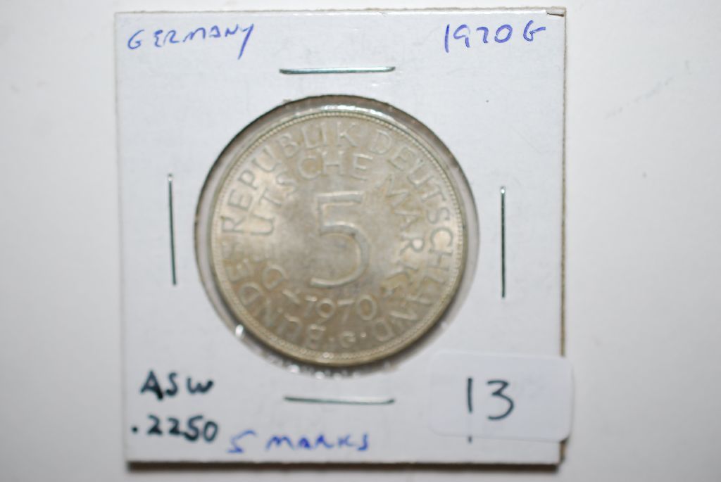 1970-G German 5 Deutsche Mark Foreign Coin; .2250 ASW; EST. $10-20