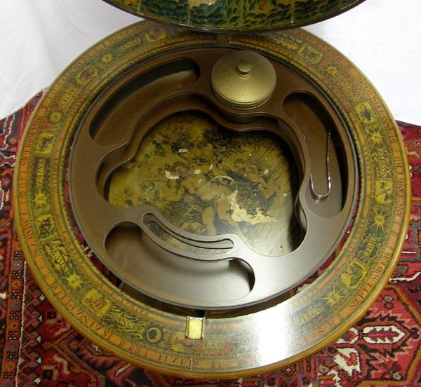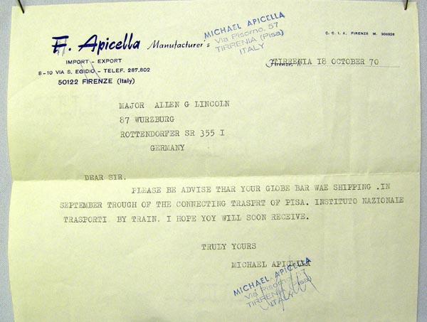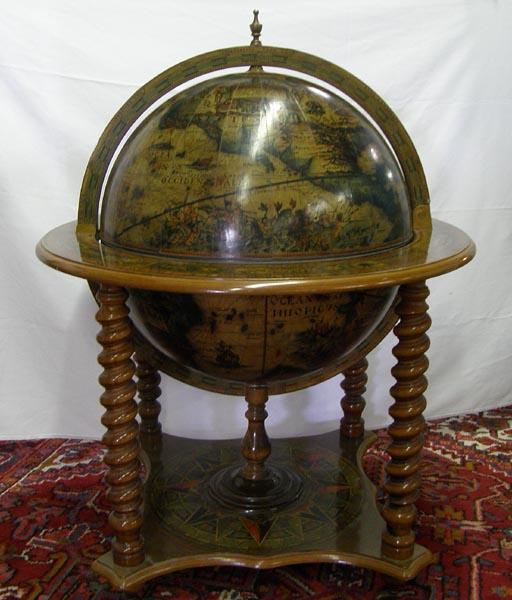 1970 Italian Globe Bar by the Apicella Mfg. Co. MUST BE PICKED UP. Includes October 18, 1970 letter from Michael Apicella to buyer, Major Allen Lincoln, Germany, stating the globe had been shipped. Barley twist hardwood legs. Measures 44'' to top of finial and 35'' wide. MUST BE PICKED UP.
