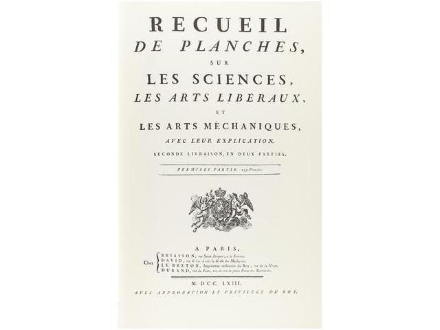 1970., LIBRO: (GRABADOS-FACSIMIL),. ENCYCLOPEDIE. DICTIONNAIRE RAISONNE´ DES SCIENCES ET DES ARTS (PARIS, 1772)., Coordinación de Jorge Luis Borges y Roland Barthes. Bologna: Franco Maria Ricci, 1970-1979. 18 vol. en folio mayor. Facsímil de la edición original editada entre 1751 y 1772, impresa en papel verjurado. Enc. en tela con dorados en el lomo. Cada volumen presentado en un estuche en cartoné. Excelente estado de conservación. Edición de bibliófilo limitada a 3000 ejemplares. Contenido: 5 tomos de textos, 2 columnas, más de 1000 artículos; 12 tomos con 2880 planchas de grabados, algunas en hojas desplegables; 1 tomo inédito de una serie de pruebas y cerca de 200 biografías de autores de l´Encyclopedie, con retratos. Obra completa.