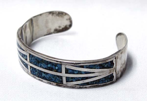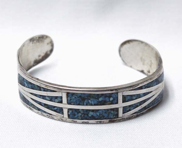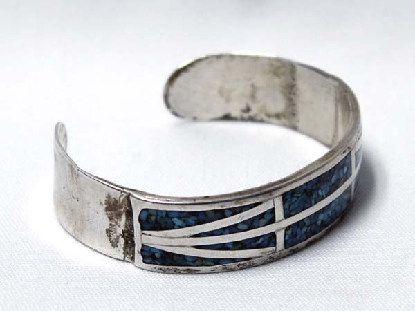 1970 Native American Navajo Sterling Chip Inlay Turquoise Bracelet, older piece of jewelry, all sterling silver, inside measures 6'' which includes opening x .5''W, 30g in total wt.