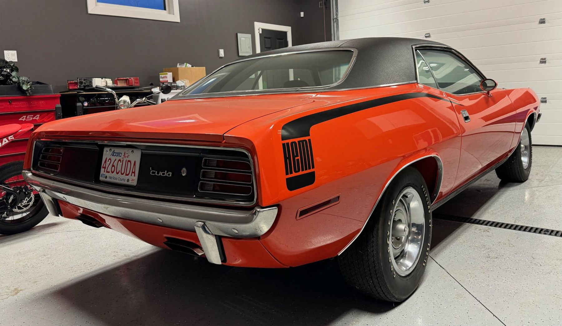 Real deal matching numbers 426 Hemi Cuda. Beautifully restored, rotisserie to factory specifications incredibly rare options real deal JC 426 hemi shaker, and one of the most desirable colour combinations, including black vinyl roof
