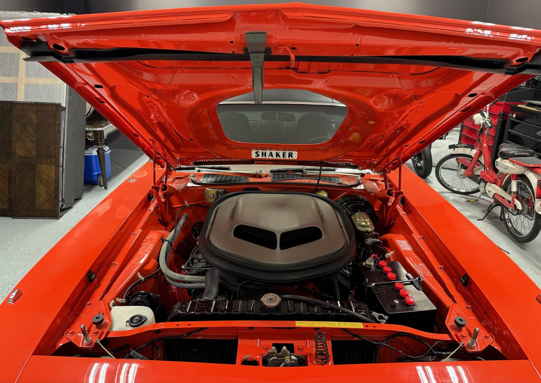 This fully rotisserie restored hemi orange, well optioned, all numbers matching hemi cuda, is equipped with its factory a 4 speed manual transmission, and hemi motor.