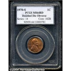<B>1970-S<1C> Doubled Die MS64 Red PCGS.</B></I> FS-029, DDO 1-O-I. A highly coveted variety that exhibits bold die doubling on LIBERTY and IN GOD WE TRUST. The 0 in the date is also clearly doubled. A nicely struck and lustrous near-Gem with magenta-red color and a few minor handling marks. This <I>Guide Book</B></I> variety is one of the major stoppers to a complete collection of Memorial Reverse Cents. Population: 14 in 64, 5 finer (3/04). <BR><BR><B>Important notice:</B> Heritage usually auctions material at the rate of 200-250 lots per hour. On some occasions eBay Live bid software or the Internet may not be able to keep up with the pace of the auction. We recommend placing a realistic absentee bid now as insurance to avoid disappointment. Occasionally the auctioneer may eliminate or reject an eBay Live bid, and the auctioneer may also reopen a lot after the close of the eBay live bidding (usually because we missed an audience bid), and may reject your bid even if it shows you as the winning bidder. By bidding via eBay Live, you agree that Heritage may award the lot to another bidder at its sole discretion under the circumstances described above or any other reasonable circumstances. Since eBay bids are not shown to us until we open the lot on the floor, we treat those bids just like floor bids. In most cases the floor responds before the eBay bid is presented to us, due to Internet lag time, so for consistency we have made it a policy that floor bids are always considered first over tie eBay live bids. Also please note that all Heritage lots purchased through eBay Live carry a 20% Buyer's Premium. Please make sure you read the Terms and Conditions before you bid.