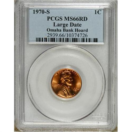 <B>1970-S 1C Large Date MS66 Red PCGS.</B></I> Ex: Omaha Bank Hoard. PCGS Population (282/16). NGC Census: (194/6). Mintage: 693,192,832. Numismedia Wsl. Price for NGC/PCGS coin in MS66: $80. (#2939)<BR><BR><b>Shipping:</b> Coins & Currency (<a target="_blank" href="http://www.heritageauctions.com/common/shipping.php">view shipping information</a>)