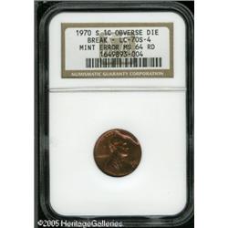 <B>1970-S 1C Large Date--Obverse Die Break--MS64 Red NGC.</B></I> LC-70S-4. A big die break dominates the obverse periphery from 11:30 to 2 o'clock. The bottom of CENT is weak, as it is opposite the die break. Ruby-red hues add zest to the primary orange-gold color. Lot:10866