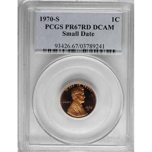 <B>1970-S 1C Small Date PR67 Deep Cameo PCGS.</B></I> Vibrant reddish-orange surfaces and undeniable contrast are the most immediately apparent aspects of this delightful Superb Gem. A great representative of the elusive Small Date 1970-S proof issue. Population: 35 in 67 Deep Cameo, 21 finer (10/07).<BR><BR><b>Shipping:</b> Coins & Currency (<a target="_blank" href="http://www.heritageauctions.com/common/shipping.php">view shipping information</a>)
