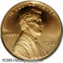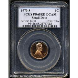 <B>1970-S 1C Small Date PR68 Red Deep Cameo PCGS.</B></I> A boldly struck Superb Gem with lovely color and exquisite preservation. There is a tiny planchet mark between the 9 and 7 of the date, and a toning spot above the E of CENT. A scarcer modern proof <I>Guide Book</B></I> variety. Population: 18 in 68, 1 finer (1/05). Lot:5625