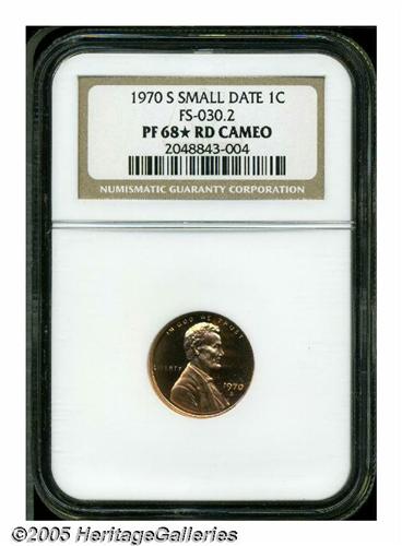 <B>1970-S<1C> Small Date PR68 <S Red Cameo NGC.</B></I> FS-030.2. A splendid pumpkin-orange example, well struck and magnificently preserved. The Cameo contrast is undeniable. The Level 7 or Small Date variety remains elusive despite decades of searching by numismatists. LIBERTY is weakly defined, a diagnostic of the Small Date.